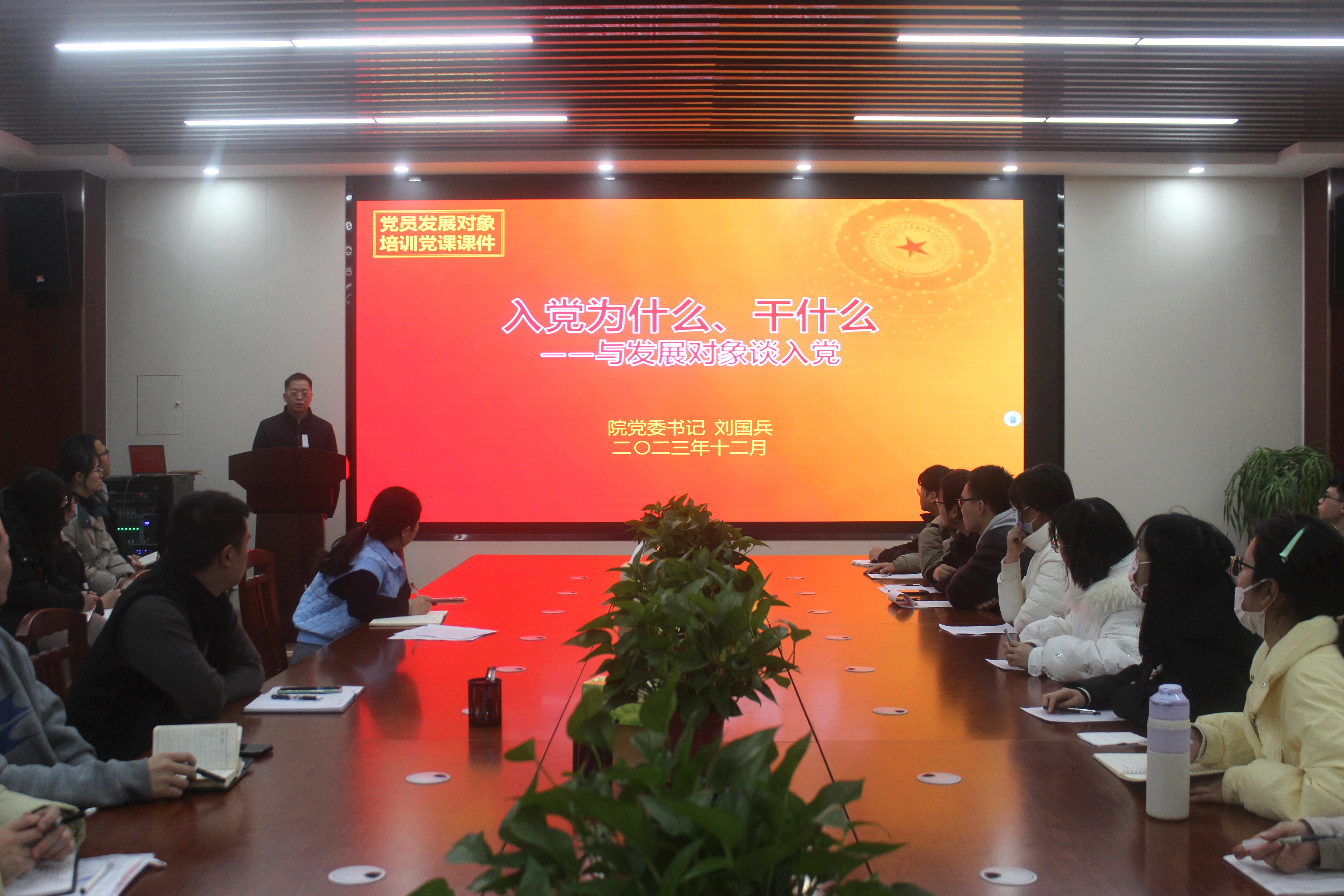 刘国兵围绕“入党为什么、干什么”的主题与发展对象谈入党。首先以习近平总书记在庆祝中国共产主义青年团成立100周年大会上发表的重要讲话:“入队、入团、入党是青年政治进步的‘人生三部曲’。”勉励各位发展对象:青年党员是确保红色江山永不变色的重要基石,并强调组织上入党是一时的,而思想上入党是一生的。然后又提出了“我是谁,为什么要加入中国共产党”和“我想成为谁,加入中国共产党要干什么”这两个问题,通过对各支部发展对象代表的提问,帮助学生端正了入党动机,考察了发展对象对党的基本理论知识的学习程度和对个人专业素质综合能力的认识。最后刘国兵书记又带领大家学习党章的部分内容,着重学习和强调了党员的义务和权利,并以习近平总书记在世界经济论坛2017年年会开幕式上的主旨演讲的重要讲话“遇到困难,不要埋怨自己,不要指责他人,不要放弃信心,不要逃避责任”勉励各位发展对象卓越奋进。发挥先锋模范带头作用。