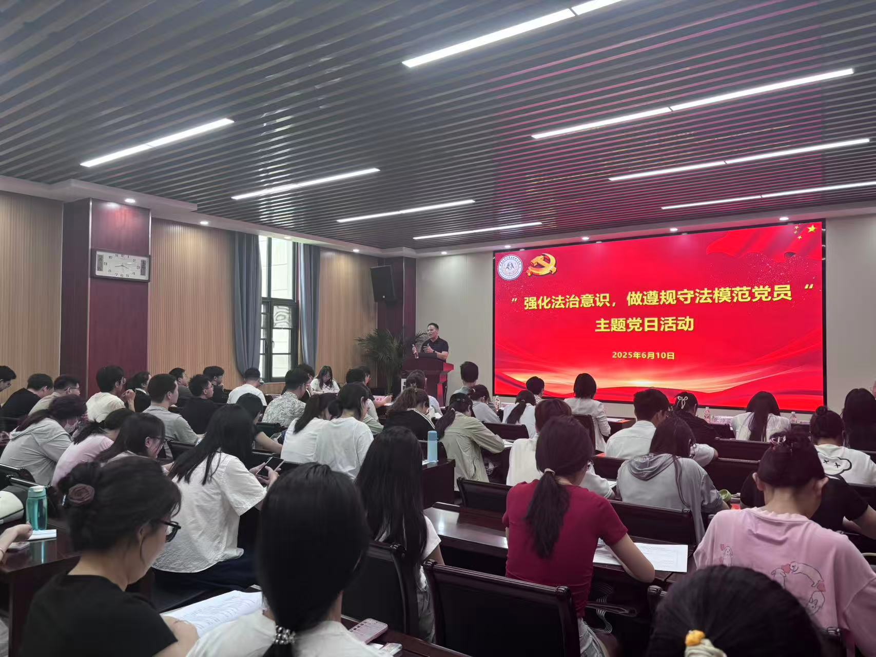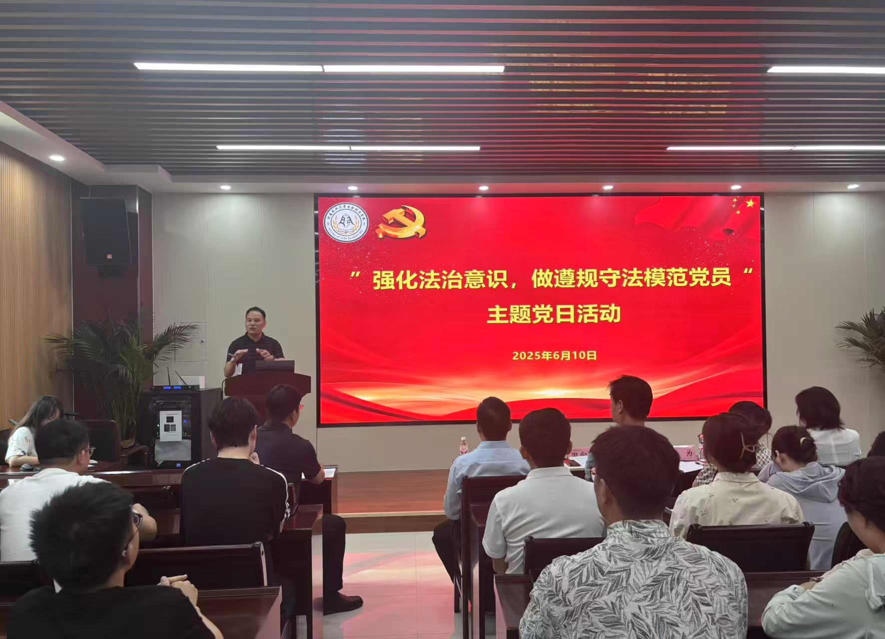 学生党支部与校机关党委党支部、审计政法党支部在龙子湖校区第二实验楼231会议室隆重举行“强化法治意识,做遵规守法模范党员”主题党日活动。校机关党委书记李为、校审计处处长田向阳、校政策法规办公室主任闫俊萍、校政策法规办公室副主任张帅梁、上海市海华永泰(郑州)律师事务所姬瑞明受邀出席。院党委书记刘国兵和各学生支部书记出席会议,2025届全体毕业生党员参加会议,院党委副书记张世昌主持本次会议。