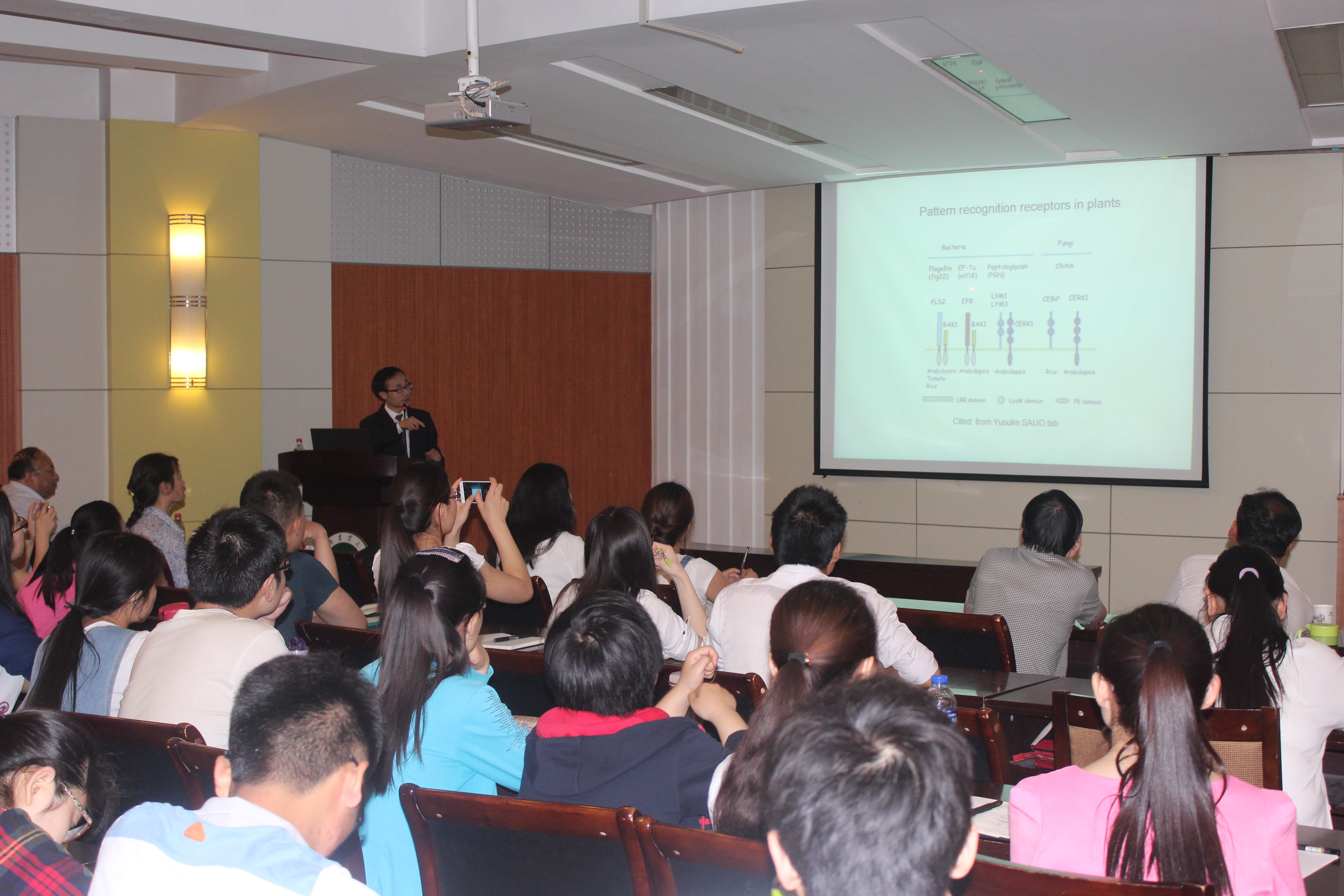 的广大师生。冯锋博士长期从事植物和病原微生物以及共生真菌互作的研究,试图阐明植物天然免疫和共生信号转导的分子机理,主要研究成果以第一作者在Nature、Cell host & microbe, Current opinion in plant biology等期刊发表,主持国家自然科学基金面上项目一项,并于2012年获得吴瑞奖学金。报告会上,冯博士结合自己的科研项目,详细讲述了影响植物共生和免疫物质作用的机理等相关知识,并热情与师生探讨学术报告的相关问题,激发了老师和研究生的科研热情。
