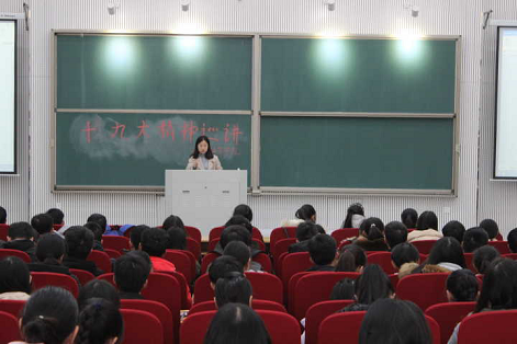 首先,团委老师张晶给同学们讲了十九大的大会主题,指出中国共产党的初心和使命就是为中国人民谋幸福、为中华民族谋复兴,要求每位同学都需把大会主题牢记在心。接着结合社会的发展变化实例向同学们介绍了在我党领导下的过去五年的历史性成就和历史性改革,案例丰富且直观的让同学们感受到国家的发展变化成果。然后根据习近平总书记在十九大报告中关于青年一代最新指示,指出银河娱乐App “大志,大爱,大雅”三大教育方针与十九大中提出青年一代要“有理想,有本领,有担当”深度契合,需要学生在日常的学习生活中积极贯彻落实党的十九大精神。最后对同学们提出学习十九大精神的具体要求,要求同学们要读十九大精神原文、要看主流抓主干、要坚持学而思学而行,并分享了一些学习十九大精神的平台。巡讲结束后现场响起了雷鸣般的掌声,张晶老师的细致讲解,使同学们受益匪浅,无一不流露出为祖国自豪的神情。