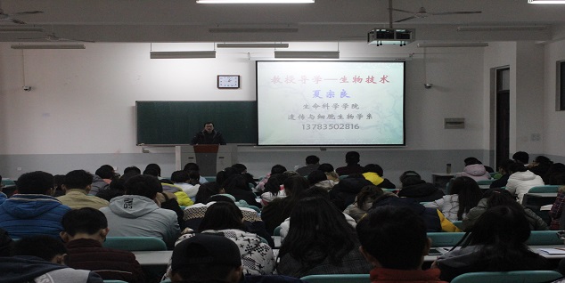 夏宗良教授是我省教育厅学术技术带头人,银河娱乐App 硕士生导师。夏教授通过展示一些转基因案例和自己的科研成果,并结合自身学习经历,对生物技术专业及其就业前景做了详细讲解。陈红歌教授是我省微生物学会常务理事,银河娱乐App 微生物学科第二学术带头人。陈教授通过展示实验图片、数据以及相关论文片段,对合成生物学的应用和现存问题做了详细讲解,并纠正了同学们对生物工程专业的一些错误看法。两位教授热心地回答了同学们就自身疑惑做出的提问,他们幽默诙谐的讲解方式给16级同学留下了深刻的印象。