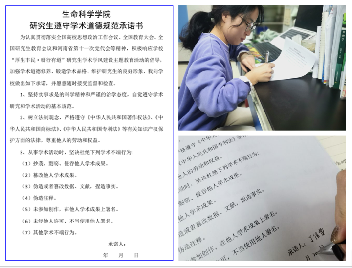 通过新媒体公众号“X先生”发布倡议书,研究生其他年级也通过主题党日、团日活动,开展科学道德与学风建设主题教育,积极签署《学术道德规范承诺书》。