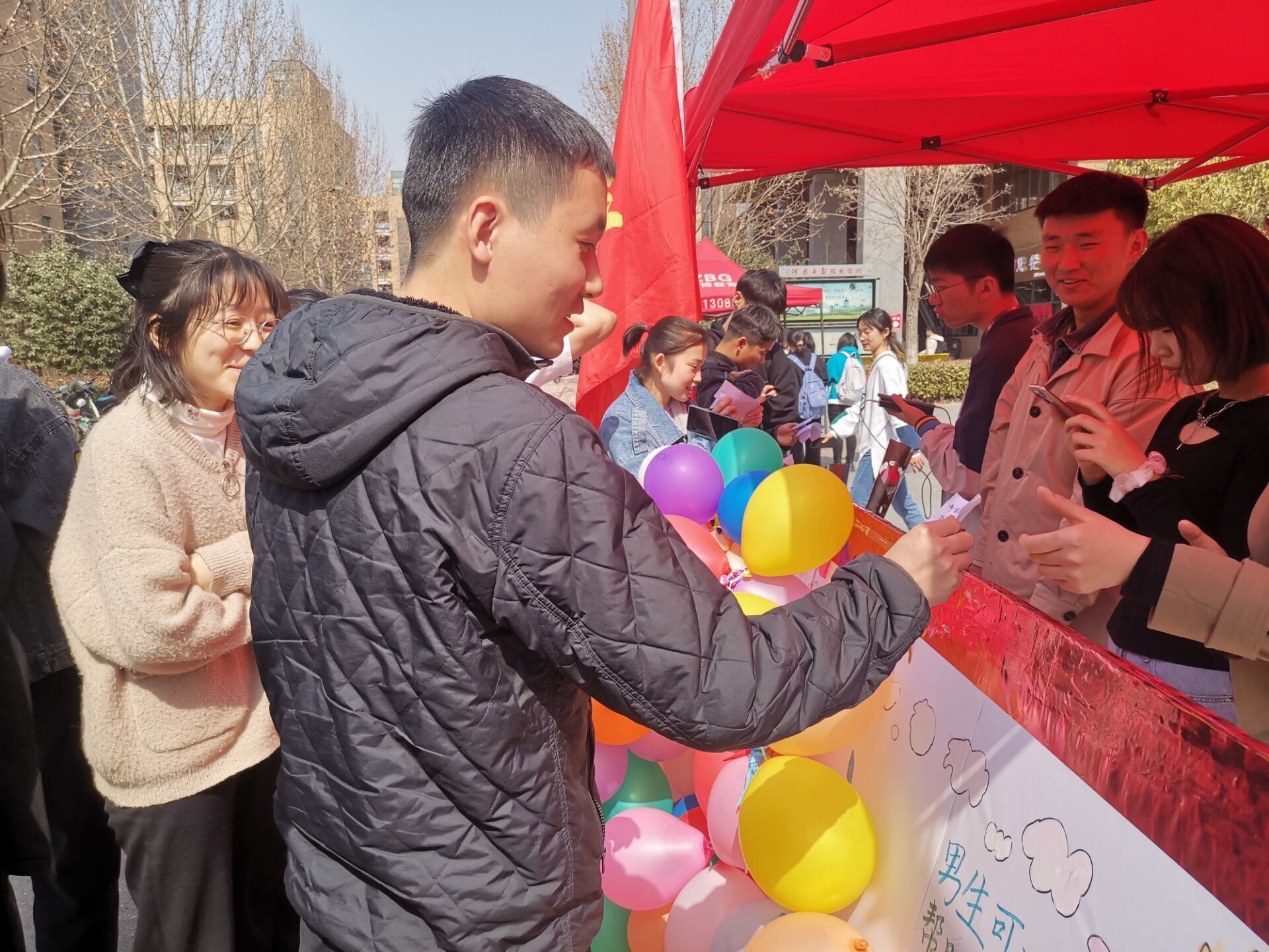 本次女生节活动分为“心愿气球”和“知识问答”两个环节。在“心愿气球”活动中,银河娱乐App 女生提前将姓名、心愿及联系方式写进纸条并装进气球中,由学生会成员粘贴于展板上。活动当天,心愿墙展板在龙子湖校区第一餐厅广场和文化路校区八号楼门前展出,吸引不少学生驻足观看。男生随机抽取气球,负责实现女生的愿望,他们化身“暖男”、“绅士”,为女生打水、买饭、取快递等等,女生们纷纷表示,“心愿气球”活动给她们带来了无限的惊喜与感动。在一个个气球被戳破的同时,知识问答环节也在如火如荼地进行。学生会成员提前打印北京冬奥会、党史、团史及“三品”主题教育有关题目并放入纸箱,同学们抽取题目并现场作答。同学们答题热情高涨,现场气氛十分热烈。活动期间,男生们纷纷为银河娱乐App 女生送上温情的节日祝福,在一片欢声笑语中,本次女生节系列活动圆满结束。