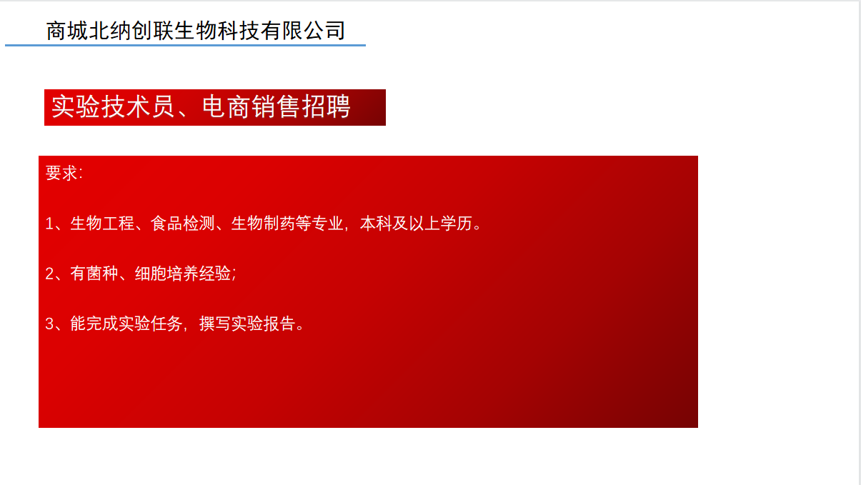 商城北纳创联生物科技有限公司招聘实验技术员、电商销售