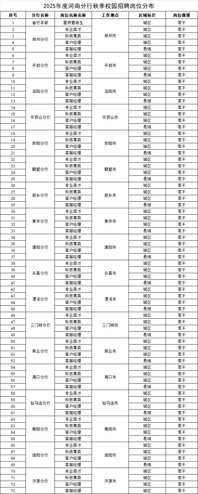 (四)客户经理。主要为零售与对公金融营销岗位引进适用性人才。新员工录用后原则上先安排至基层营业网点进行一定期限的培养锻炼,之后根据个人工作表现及工作需要等,聘入相应岗位工作。