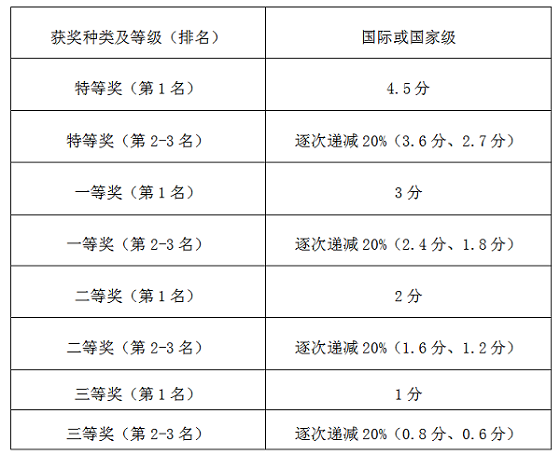 奖励分共计15分,共分为参军入伍服兵役、参加志愿者服务、到国际组织实习、科研成果和竞赛获奖等五个部分,每个部分的分值分别为2分、2分、2分、4.5分、4.5分。