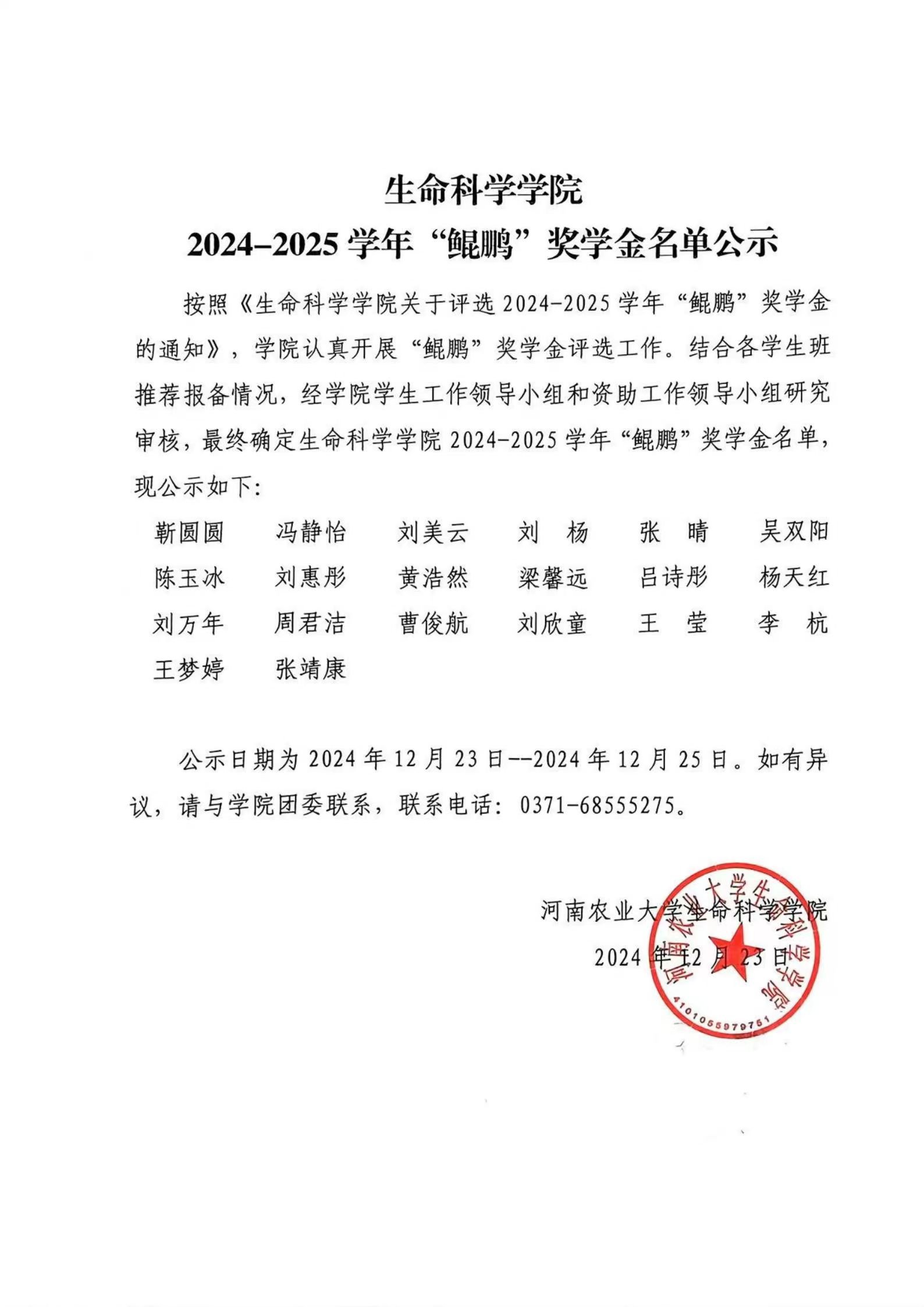 银河娱乐App 2024-2025学年"鲲鹏"奖学金名单公示