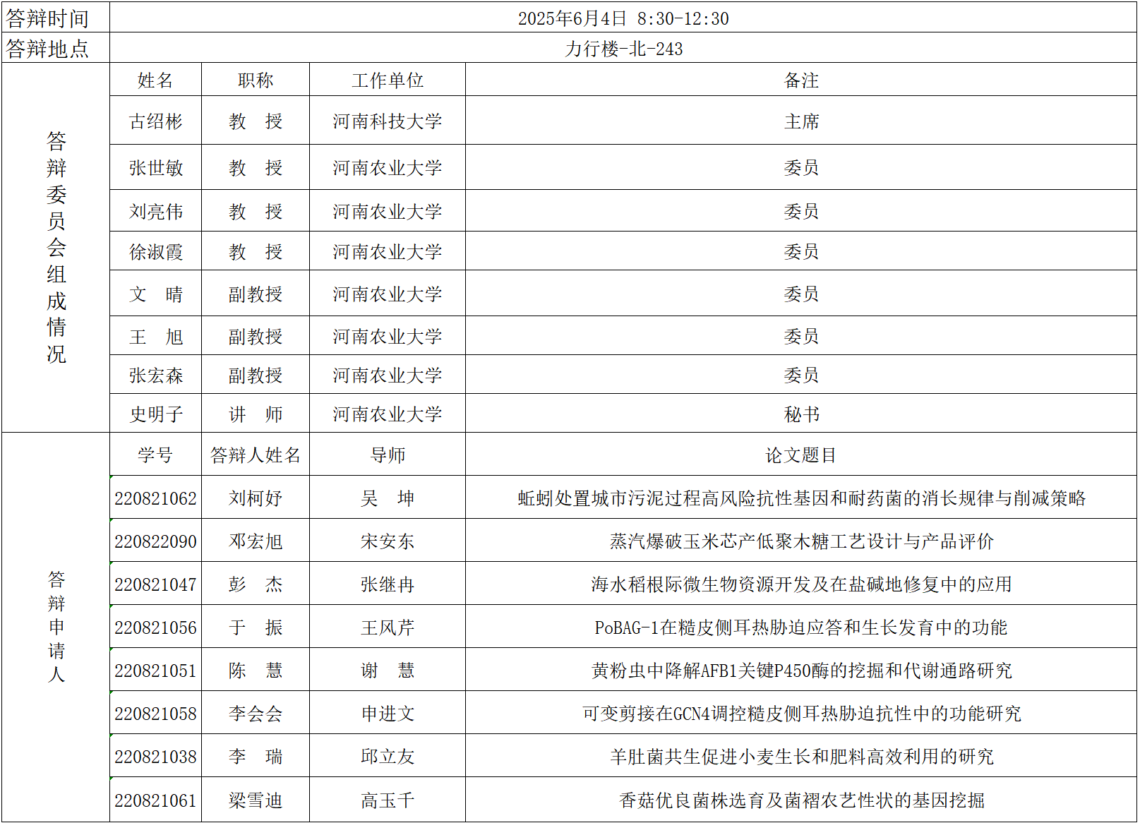 2025年上半年微生物学硕士研究生毕业答辩公告(四)
