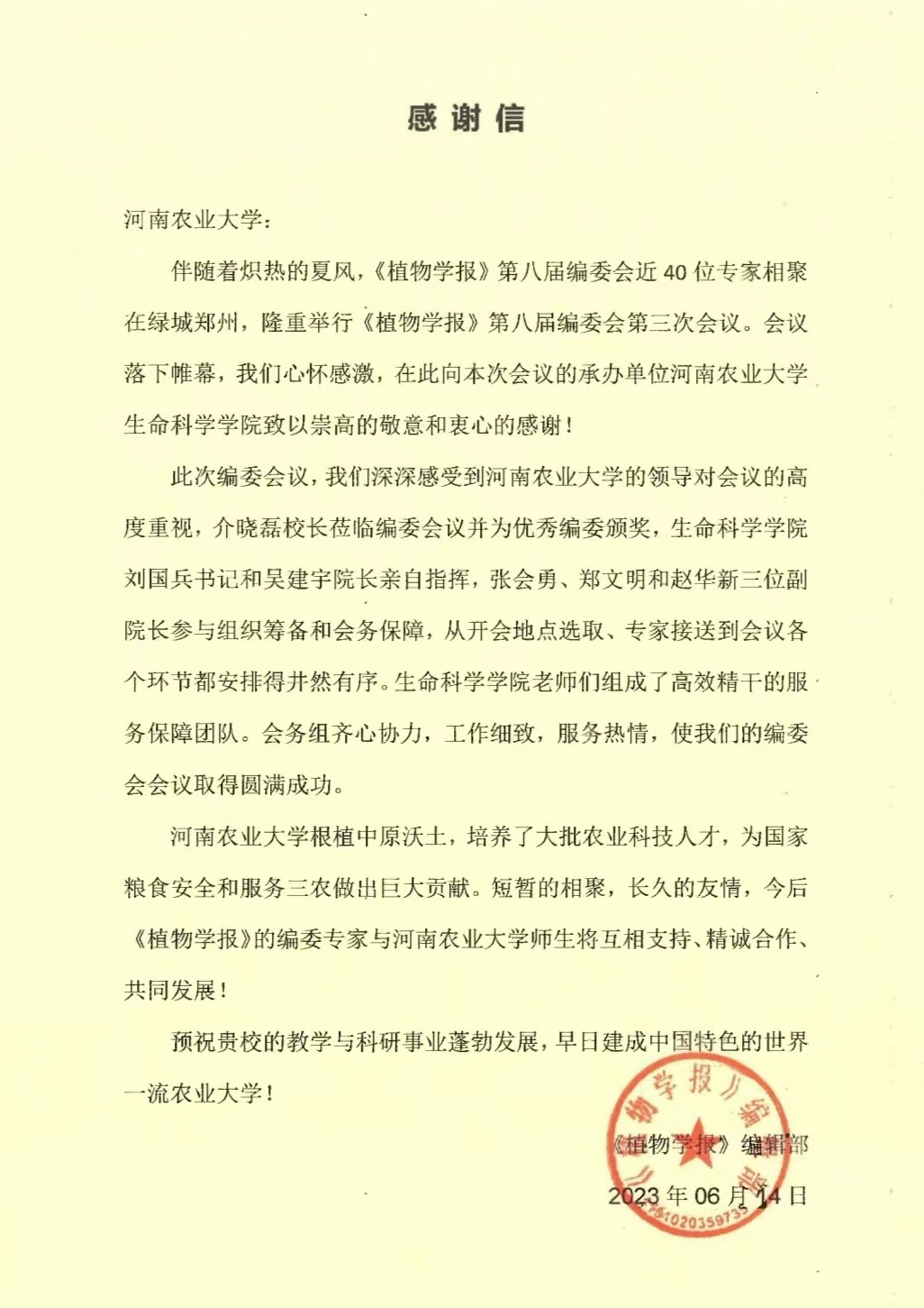本网讯(通讯员 郑真真)近日,《植物学报》编辑部向银河娱乐App 发来感谢信,感谢银河娱乐App 6月9至11日在承办“《植物学报》第八届编委会第三次会议”期间的精心组织、统筹协调,使得会议取得圆满成功。