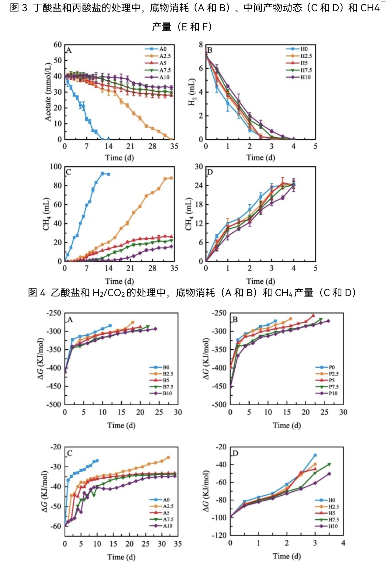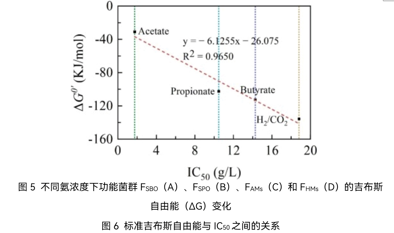 结果表明,在厌氧消化过程中,外源氨通过延长停滞期、降低比产甲烷速率和最大甲烷产量来调控功能菌群对氨胁迫的耐受性。不同功能菌群的氨耐受性差异显著,其中氢营养型产甲烷菌群对氨的耐受性最强,其IC50为18.80 g/L,其次是互营丁酸氧化菌群(IC50 = 14.26 g/L)和互营丙酸氧化菌群(IC50 = 10.47 g/L),乙酸营养型产甲烷菌群对氨最为敏感,IC50最低(1.74 g/L)。氨耐受性程度(IC50)与各功能菌群代谢反应的吉布斯自由能(ΔG0')保持一致。因此,具有更高放能能力的功能菌群表现出对氨胁迫更强的耐受性。