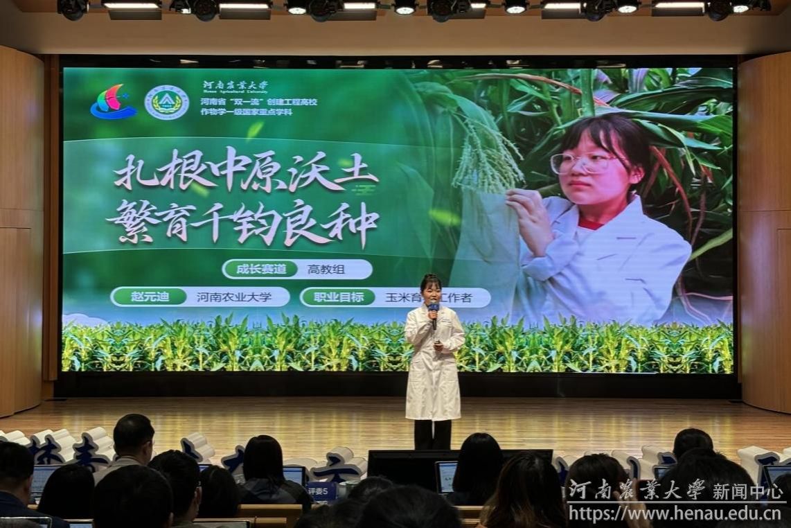在成长赛道的竞赛中,赵元迪以“玉米育种工作者”为职业目标,以“扎根中原沃土 繁育千钧良种”为主题,以坚守一生只为祖国培育良种的吴绍骙先生作为精神引领,将自己的职业生涯规划比作“春耕、夏耘、秋收、冬藏”的农业生产规律,从四个层次展开陈述,呈现自己成为一名中原育种人的成长经历。即兴问答环节,赵元迪分享了自己的科研经历及对于人工智能技术在作物育种应用的看法和思考。