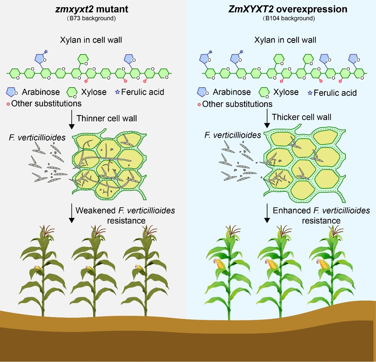 本研究前期通过遗传连锁分析鉴定到玉米种腐病抗性相关基因ZmXYXT2,该基因隶属于GT61糖基转移酶家族,编码一个潜在的木聚糖木糖基转移酶(Xylan Xylosyltransferase 2)。表达谱分析表明,ZmXYXT2在玉米全生育期各组织中呈组成型表达,且其转录水平在F.v侵染后显著上调,包括幼苗、籽粒和种子等关键器官,提示该基因可能参与多器官协同抗病过程。表型验证实验显示:ZmXYXT2功能突变导致玉米对F.v引发的苗枯病、茎腐病、穗粒腐及种腐病的敏感性增强,且玉米植株及籽粒中伏马菌素B1含量显著升高;而超表达株系则对这些病害表现出广谱抗性。进一步研究发现,ZmXYXT2过表达可重塑细胞壁组分,增加木聚糖侧链修饰水平,促使阿拉伯糖、木糖及阿魏酸含量增加;这些变化导致细胞壁增厚,从而有效抑制病原菌的胞内侵染和胞间扩散。值得注意的是,这种抗性强化并未影响玉米产量性状,反而提升了茎秆机械强度。该研究首次揭示了GT61家族基因通过调控细胞壁重构抵御镰孢菌侵染的分子机制,为创制兼具抗病性与优良农艺性状的玉米新品种提供了理论依据和关键靶点。