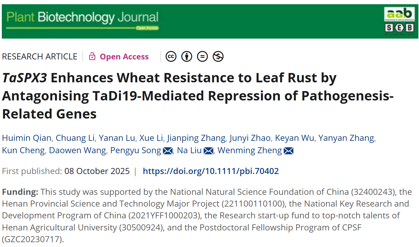 郑文明教授团队在《Plant Biotechnology Journal》上发表了题为"TaSPX3 Enhances Wheat Resistance to Leaf Rust by Antagonising TaDi19-Mediated Repression of Pathogenesis-Related Genes"的研究论文。该研究首次揭示了小麦SPX家族蛋白TaSPX3通过拮抗转录因子TaDi19对病程相关基因(TaPRs)的抑制作用,正向调控小麦对叶锈病抗性,为小麦抗病育种提供了新的分子靶点和遗传资源。