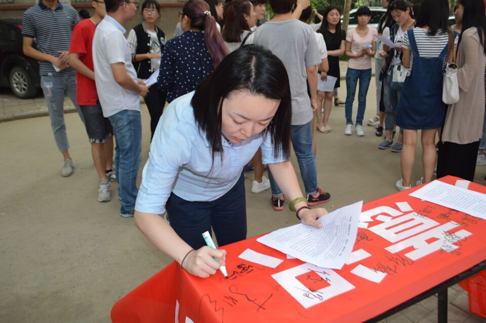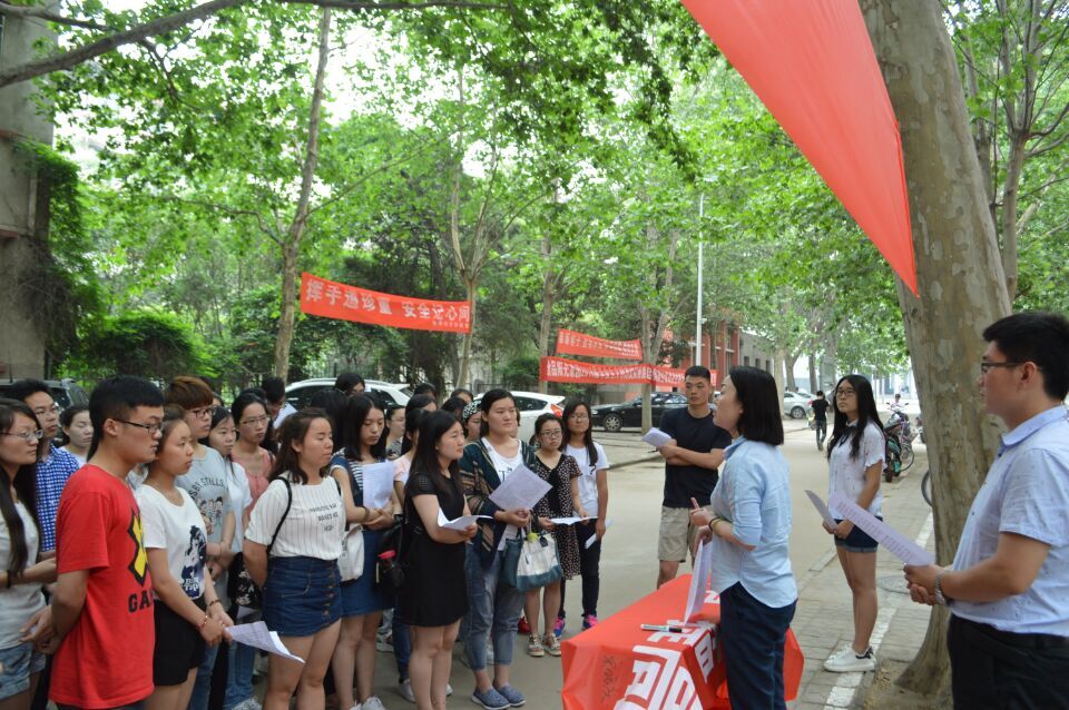 在文化路校区8号楼前开展了一场弘扬“爱国主义”,践行“两学一做”宣讲签名教育活动。参加此次活动的有院党委副书记胡明忠,院团委书记雷雯,院团委副书记黄笑,以及银河娱乐App