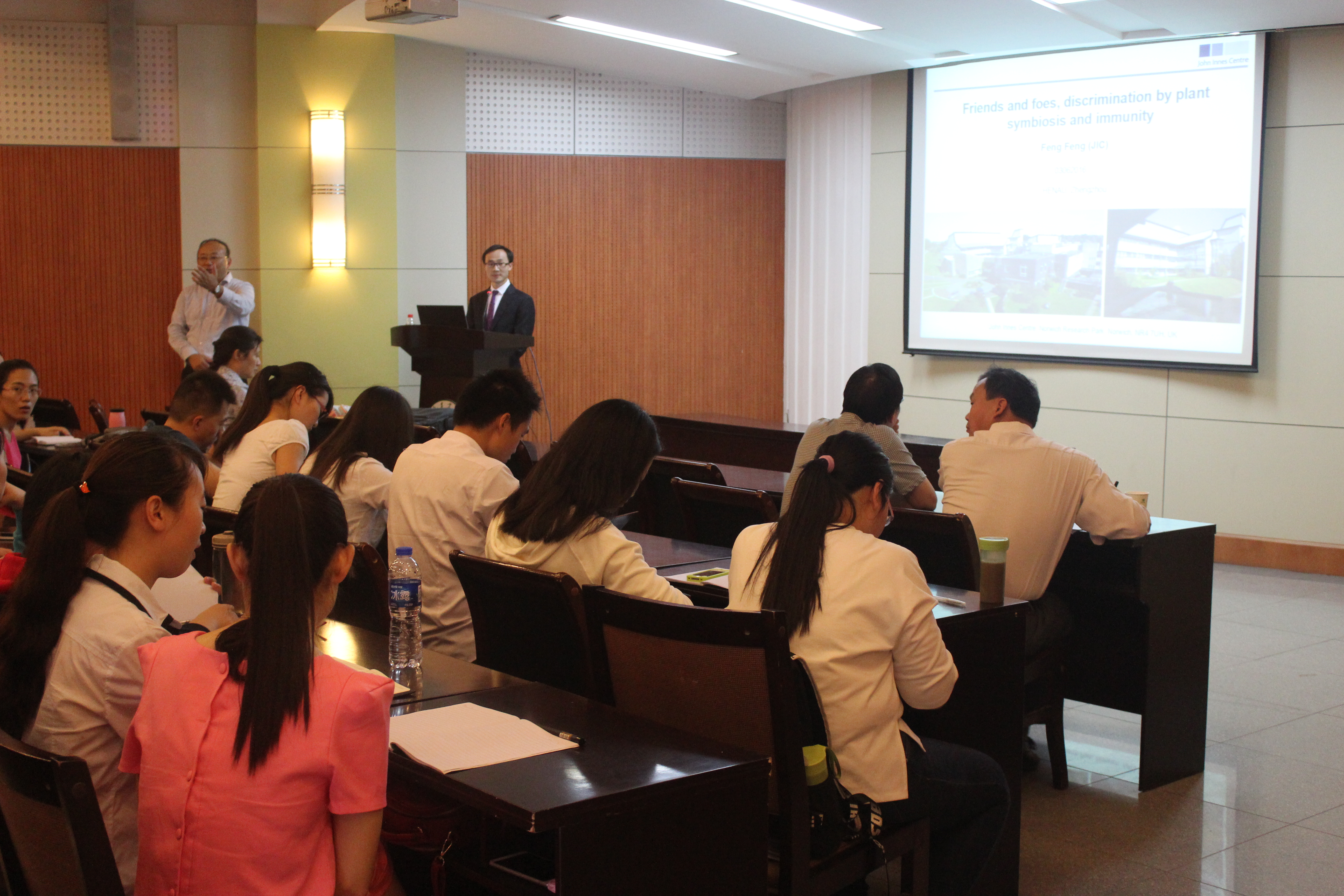 冯锋博士长期从事植物和病原微生物以及共生真菌互作的研究,试图阐明植物天然免疫和共生信号转导的分子机理,主要研究成果以第一作者在Nature、Cell host & microbe, Current opinion in plant biology等期刊发表,主持国家自然科学基金面上项目一项,并于2012年获得吴瑞奖学金。报告会上,冯博士结合自己的科研项目,详细讲述了影响植物共生和免疫物质作用的机理等相关知识,并热情与师生探讨学术报告的相关问题,激发了老师和研究生的科研热情。