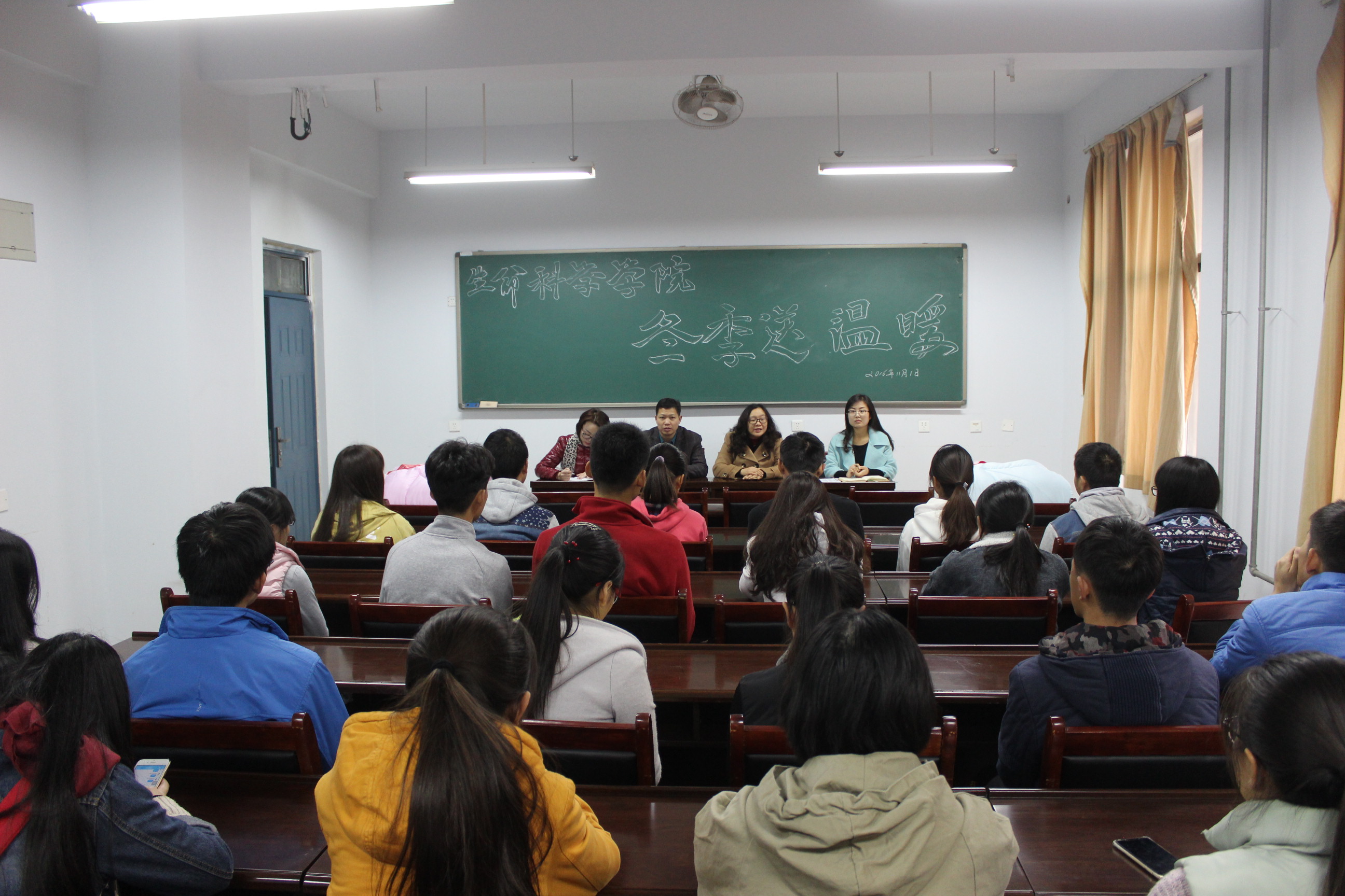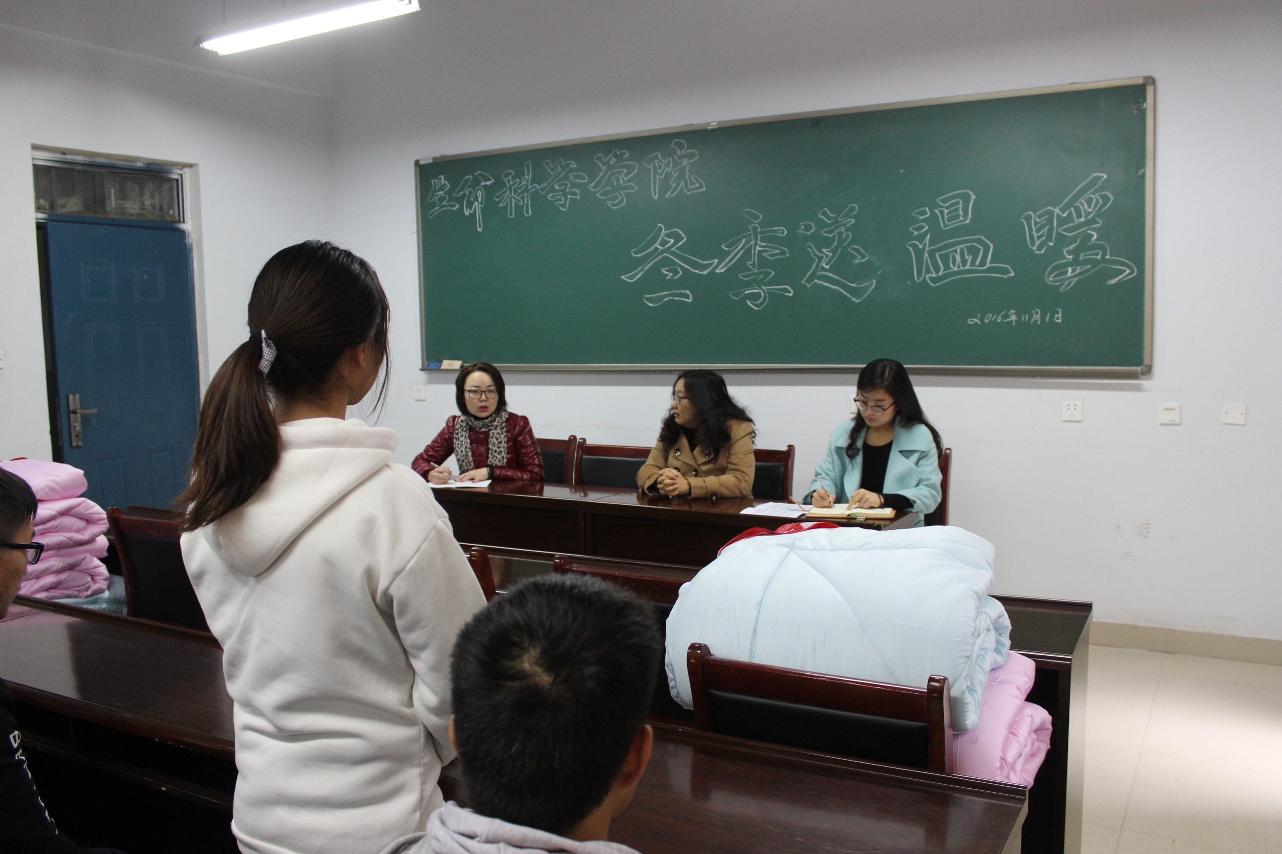 于龙子湖校区紫竹楼259会议室展开了冬季送温暖活动,院党委书记陈玲、院党委副书记胡明忠、 院团委书记雷雯、院16级辅导员姚欣以及部分16级学生参与了此次活动。