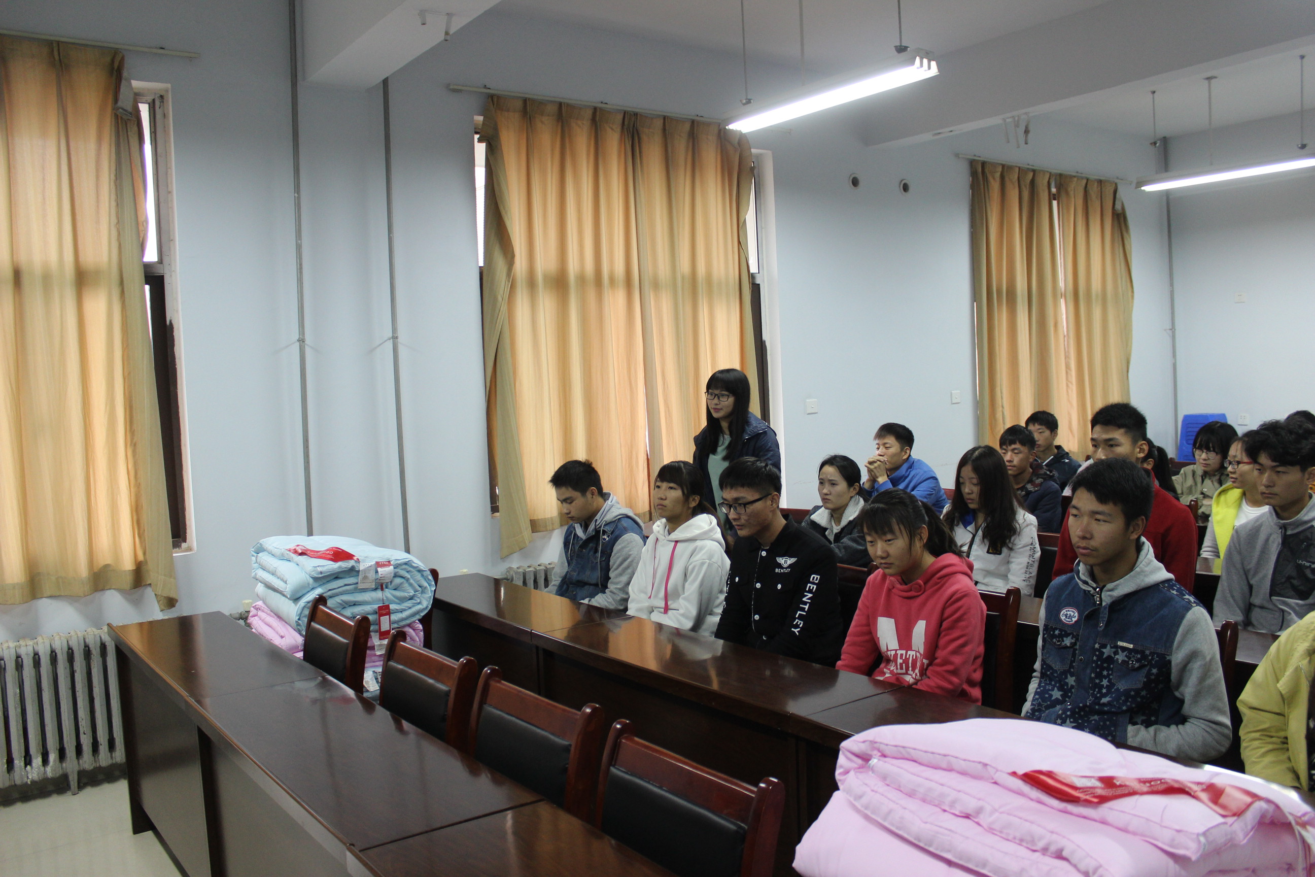 领导们真切慰问并送羽绒被给学生,关心同学们的学习、生活。同学们积极地分享自己在银河娱乐App