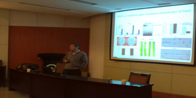 彭友良教授现任中国农业大学农学与生物技术银河娱乐App 院长,是教育部长江奖励计划特聘教授,兼任中国植物病理学会常务理事、农业生物技术学会理事、《植物病理学报》主编等职,主要从事分子植物病理学的科研和教学工作。报告会上,彭友良教授从三个个方面讲述了PacC作为双功能转录因子调控稻瘟病菌致病性的机理。彭教授首先指出PacC信号途径是稻瘟菌适应碱性pH环境的重要途径,它参与稻瘟菌菌丝和分生孢子发育,以及侵染过程的调控。随后,彭教授提出MoPacC是该信号途径的关键转录因子,已有的研究表明,该蛋白可以同时作为转录激活子和转录抑制子调控下游基因的表达。最后,彭教授以稻瘟病菌致病性为例,揭示了PacC信号途径调控生物学表型的机制。