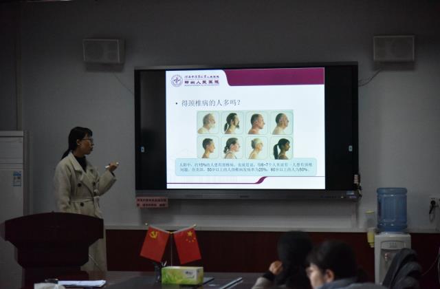 邀请郑州人民医院康复医学科副主任杨宁博士,作了题为《颈椎病的识别与自我防护》知识讲座。杨主任用通俗易懂的语言,从颈椎病的发病原因、颈椎病类型、颈椎病治疗等方面做了详细讲解,并与在场老师进行积极的交流互动,帮助大家进一步了解预防颈椎病的防治方法,倡导健康积极的生活方式。 (文/徐玉芳 图/韩旭露 )