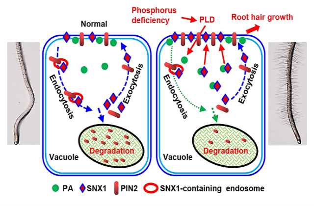 该研究发现生长素极性运输输出载体PIN2和细胞内第二信使分子磷脂酸(phosphatidic acid,PA)在低磷胁迫下促进根毛发育。低磷胁迫下,根毛区生长素浓度显著升高并促进其延伸,该现象在PIN2缺失或PLDζ功能丧失时受到抑制。正常磷情况下,PIN2蛋白在液泡中积累并降解,低磷胁迫激活PLDζ功能,升高的PA抑制了PIN2的降解。进一步的研究表明PIN2的液泡积累依赖于细胞内分选蛋白SNX1的介导。PA与SNX1结合,低磷胁迫时升高的PA促进SNX1在质膜上的积累,从而抑制PIN2在液泡中积累,促进根毛发育。