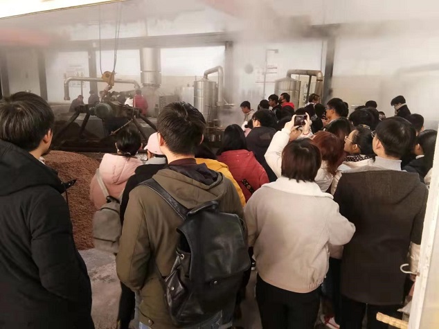 新建的教学实习基地,技术员给同学们讲述了白酒传统生产工艺中的原料选用、蒸粮、入窖及蒸酒等技术要点。同学们还品味了不同工艺生产的不同香型白酒产品。公司还举行了白酒生产知识的有奖抢答环节,同学们热情高涨,踊跃抢答,最终有60名同学获得了奖品,同学们在愉快的气氛中学到了很多传统白酒生产的知识。