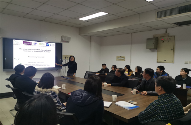 刘燕培博士2018年在巴黎第十一大学获得博士学位,之后在巴黎CNRS(法国国家科学研究中心)从事博士后研究,2019年9月底回国,在Plant Cell & Environment, Journal of Experimental Botany, Plant Physiology等期刊发表SCI 论文6篇。刘燕培博士以“Phosphoregulation of Photorespiratory Enzymes in Arabidopsis thaliana”为题,详细介绍了光呼吸通路中的关键酶丝氨酸羟甲基转移酶(Serine Hydroxymethyl Tranferase 1,SHMT1)和羟基丙酮酸还原酶(Hydroxypyruvate Reductase 1,HPR1)的磷酸化调控机制,引发了银河娱乐App 师生的热烈讨论。
