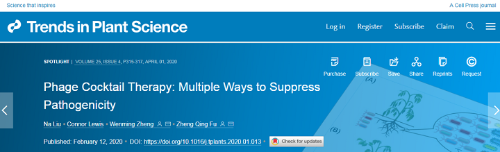 郑文明教授团队在Trends in Plant Science (植物科学趋势)发表了题为“噬菌体鸡尾酒疗法:多途径抑制致病性(Phage Cocktail Therapy: Multiple Ways to Suppress Pathogenicity)”的焦点文章。该论文综述了噬菌体鸡尾酒疗法控制植物细菌病害的重要进展。