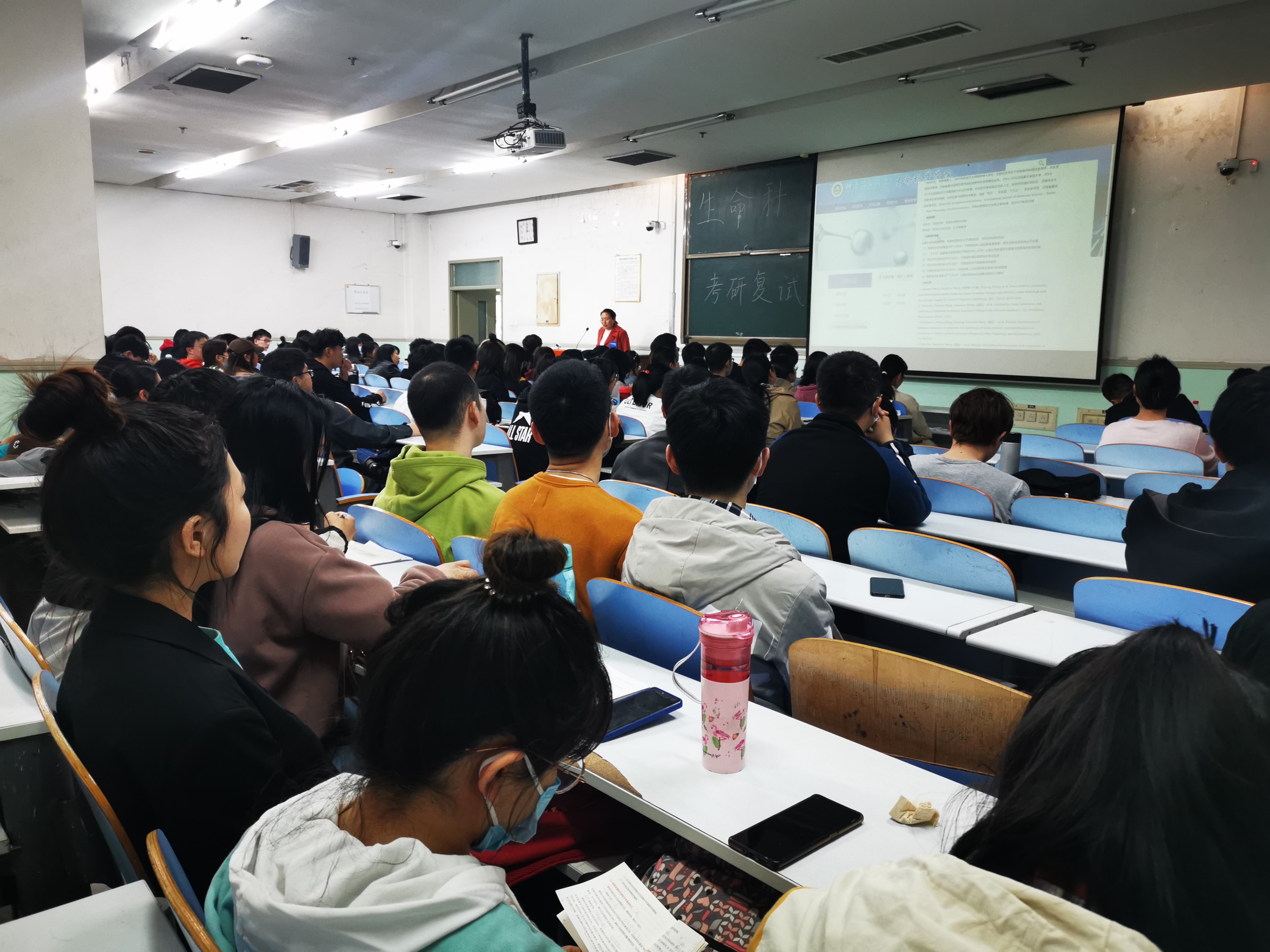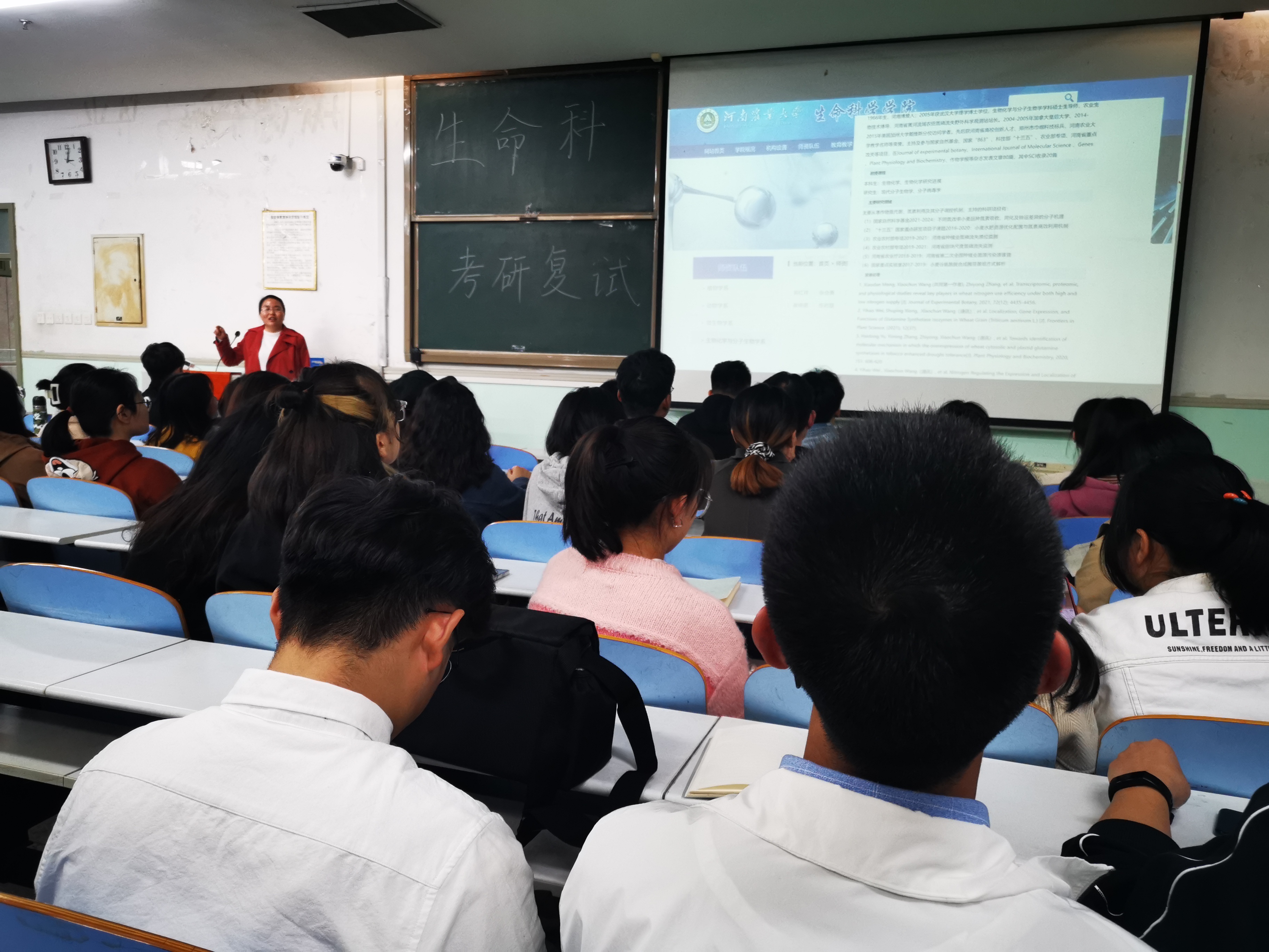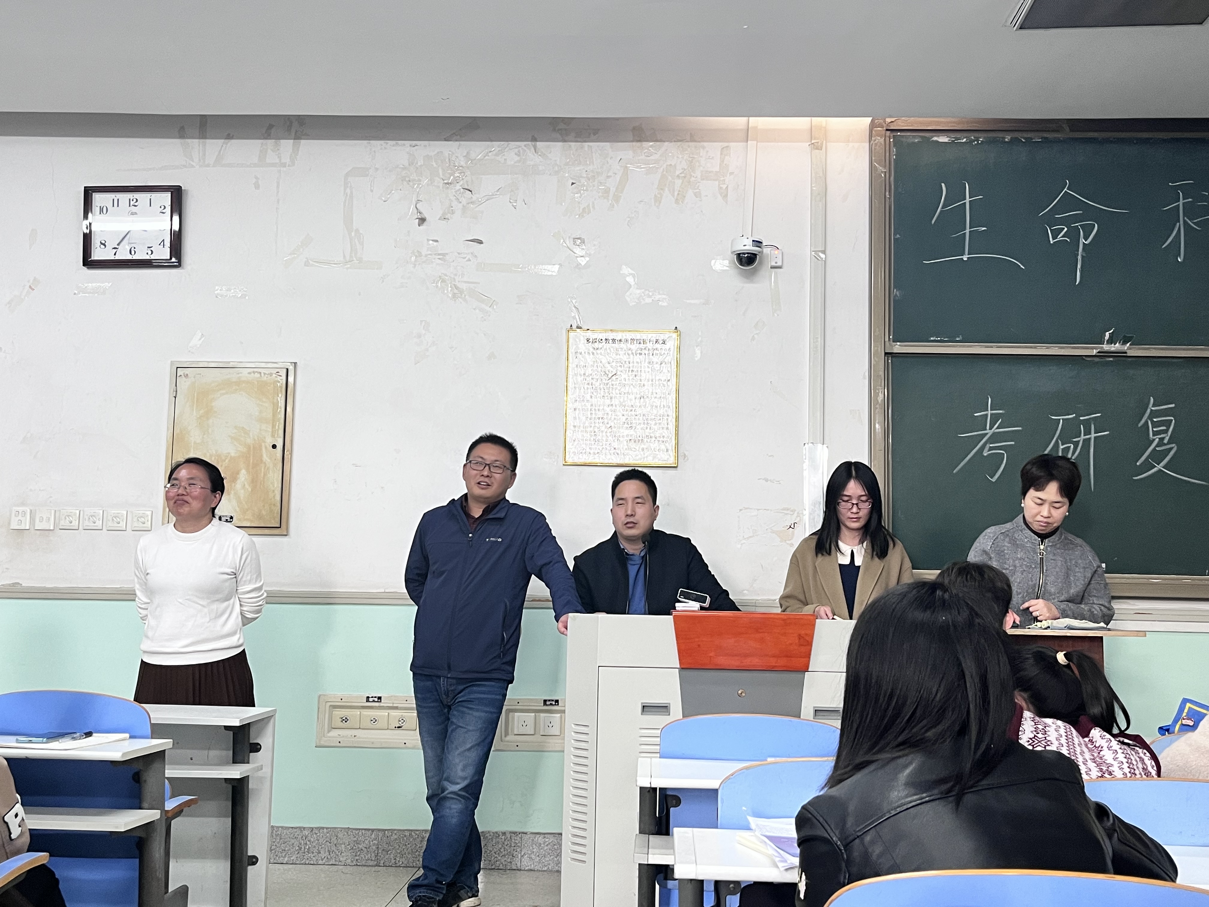 张海荣老师讲解了复试要求、未进入面试须调剂、如何联系导师等问题。金维环老师就复试面试中的语言表达、专业知识、英语口语等方面一一展开,提醒同学们“切忌慌不择路,切忌不懂装懂”。随后,同学们踊跃提出许多问题,在场的石永春老师、李会强老师和孙玉慧老师也一齐上阵,从各自的经验出发,耐心解答大家的疑问。