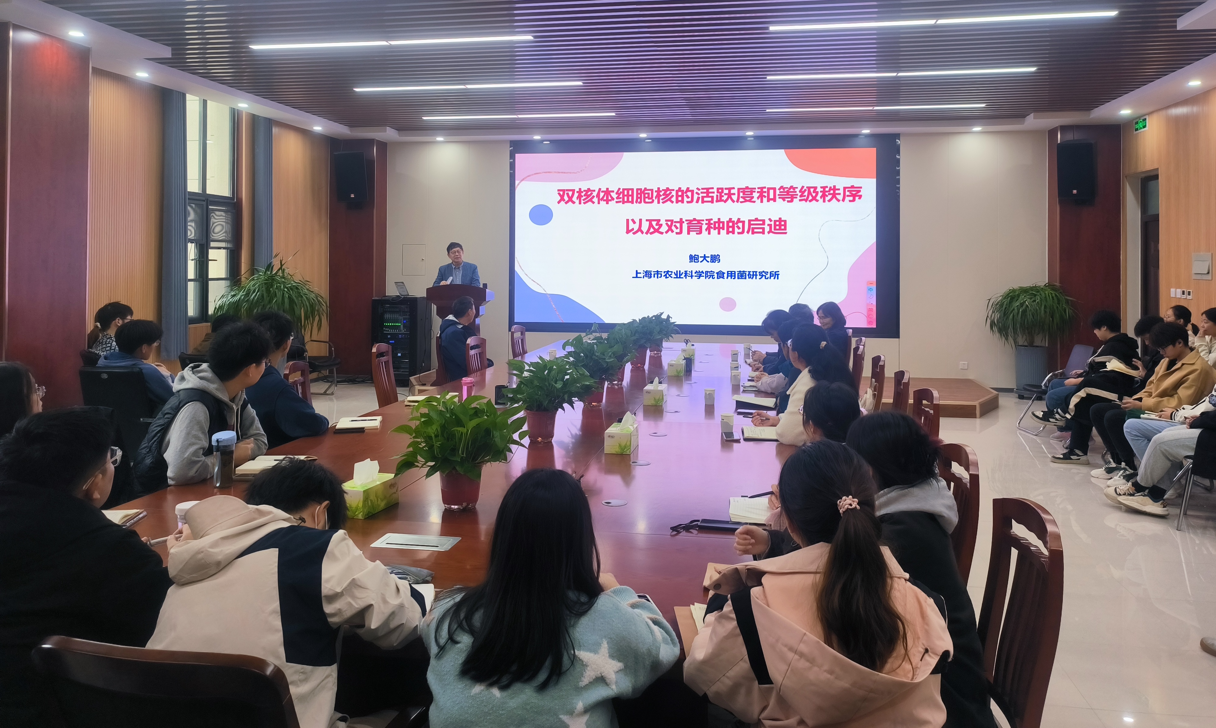 报告结束后,鲍大鹏与在场师生就食用菌细胞核强弱与农艺性状控制基因之间的关联性、菌种退化的原因、侧耳类食用菌研究中的科学问题以及影响平菇遗传转化效率的因素等进行了深入的交流探讨,参会师生收获颇多。