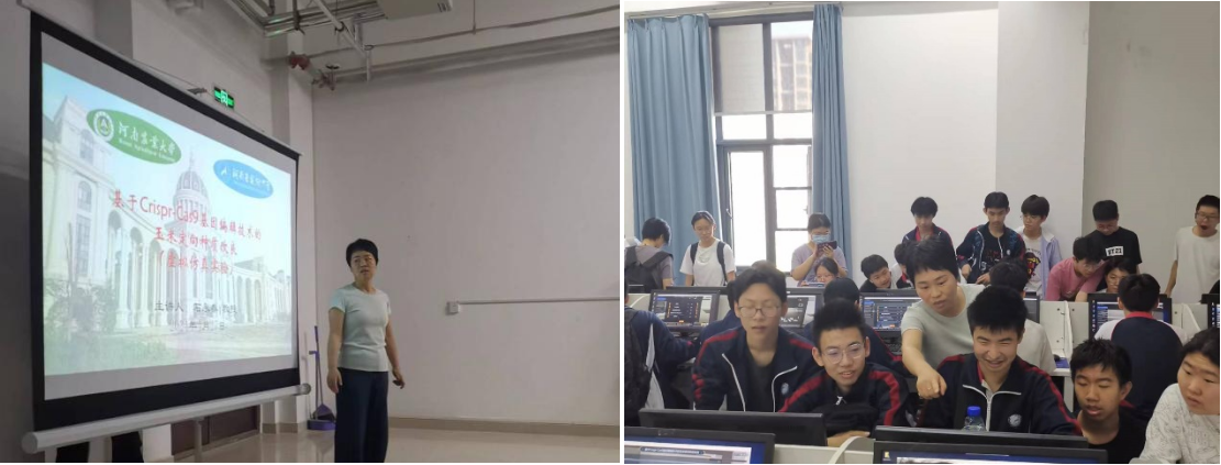 研学活动中,石永春用风趣易懂的语言向学生们详细介绍了银河娱乐App 精品课程《基于Crispr-Cas9基因编辑技术的玉米定向种质改良虚拟仿真实验》,并在上机实践环节对操作和具体的分子生物学概念进行了专业指导。通过实际参与虚拟仿真实验操作,学生们对Crispr-Cas9基因编辑技术及整个流程所涉及的具体实验,如pCAS9-mono载体的线性化、靶位点gRNA引物的复性、T4连接酶连接载体、大肠杆菌转化和质粒提取、农杆菌Gv3101的转化、玉米幼胚的收集及侵染和愈伤组织的筛选与再生等形成了更加深刻的认识。同学们在实验环节对分子生物学展现出极大的热情,实验成功完成率达到96%。