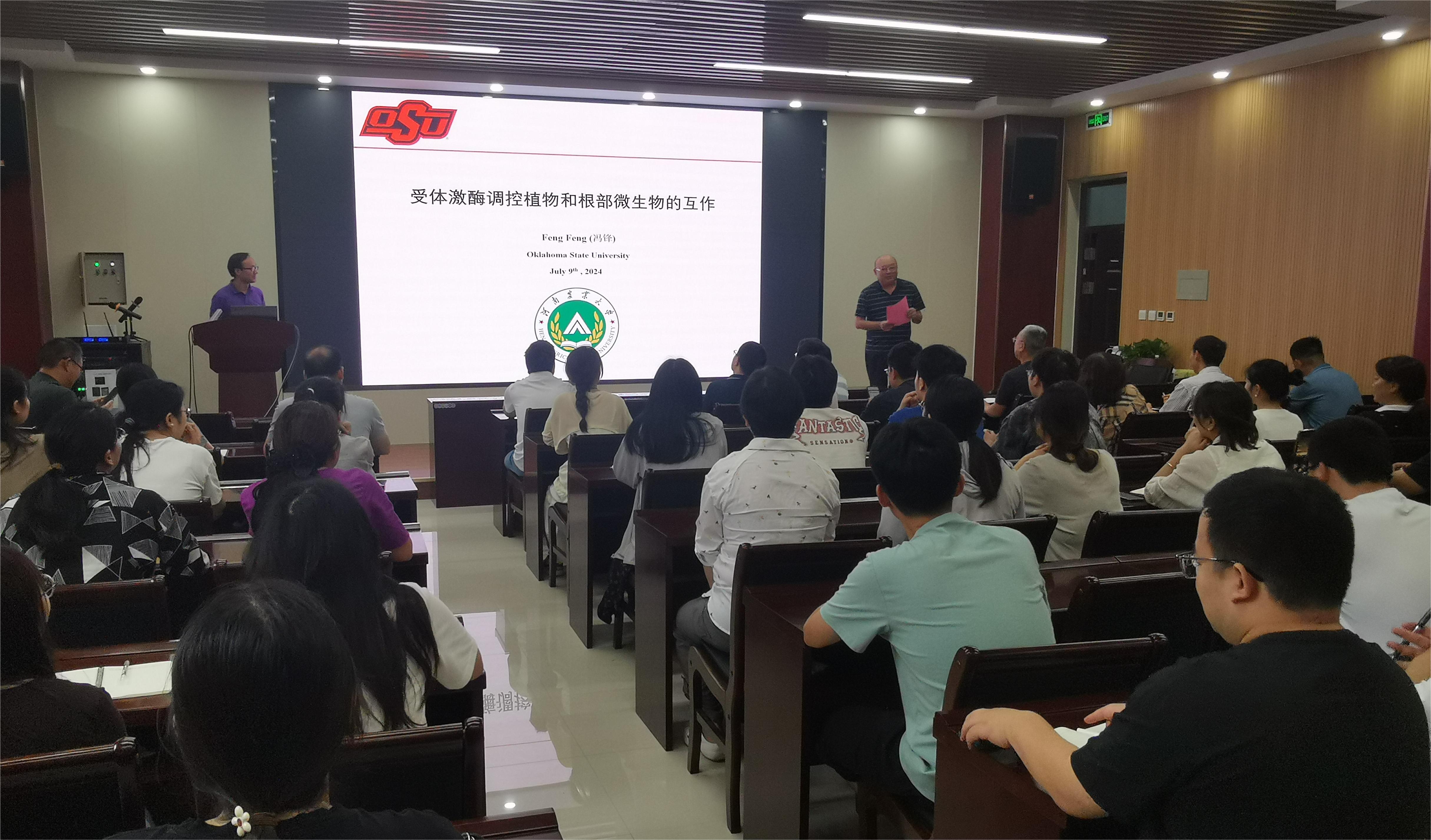 冯锋以《受体激酶调控植物和根部微生物的互作》为题,从共生-免疫两个方面深入浅出地讲述了其科研团队近年来的研究成果。苜蓿LYK9在调控苜蓿根部与微生物共生与免疫过程中发挥了重要作用,不同的辅助因子与LYK9互作,进而介导了不同的共生-免疫信号通路。同时,辅助因子LYK8在共生-免疫中也发挥了重要作用。植物免疫系统在低氮低磷的环境下受到抑制,植物体根部和微生物之间维持着共生与免疫的动态平衡。