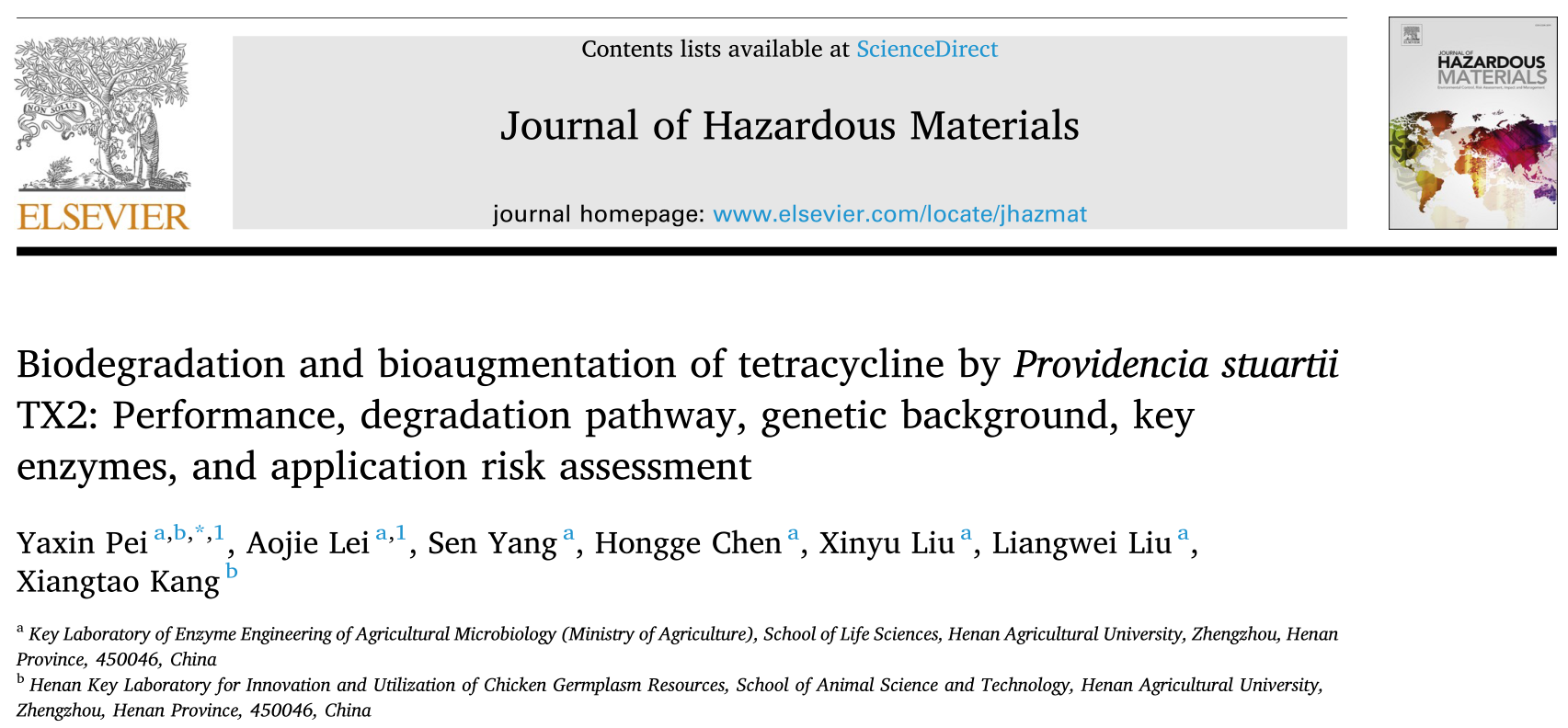 酶工程团队青年教师裴亚欣在国际著名学术期刊《Journal of Hazardous Materials》在线发表了题为“Biodegradation and bioaugmentation of tetracycline by