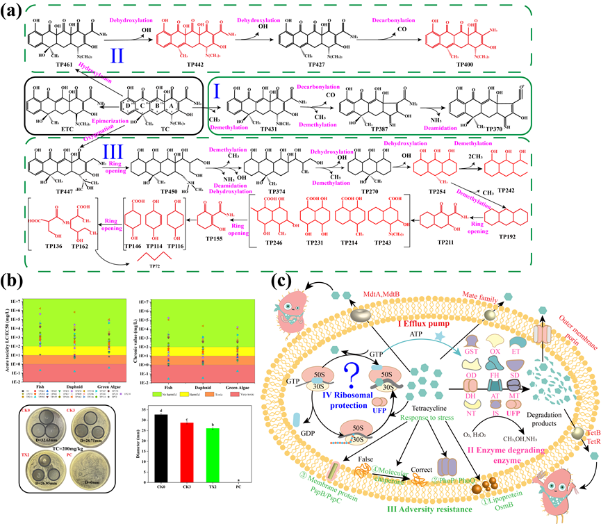采用超高液相色谱-四极杆飞行时间质谱联用鉴定到27种产物,推测了三条生物降解途径。其中,途径II和途径III是两种全新途径。结合ECOSAR软件和圆盘扩散法进一步验证了TX2生物降解降低了TC的毒性。多组学联合分析,阐明了TX2对TC耐受和降解的三种机制(图2)。