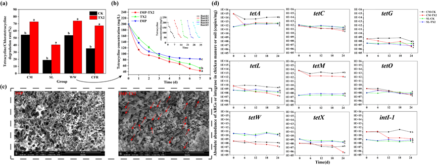 Providencia stuartii TX2,实现了对TC污染物的高效去除,揭示了TX2在高浓度TC压力下的存活与降解机制,并评价了其在多种环境下的生物修复应用的潜力。该研究不仅为抗生素污染环境的生物修复提供新的菌种资源,并且为抗生素的生物降解机制提供了新的见解。