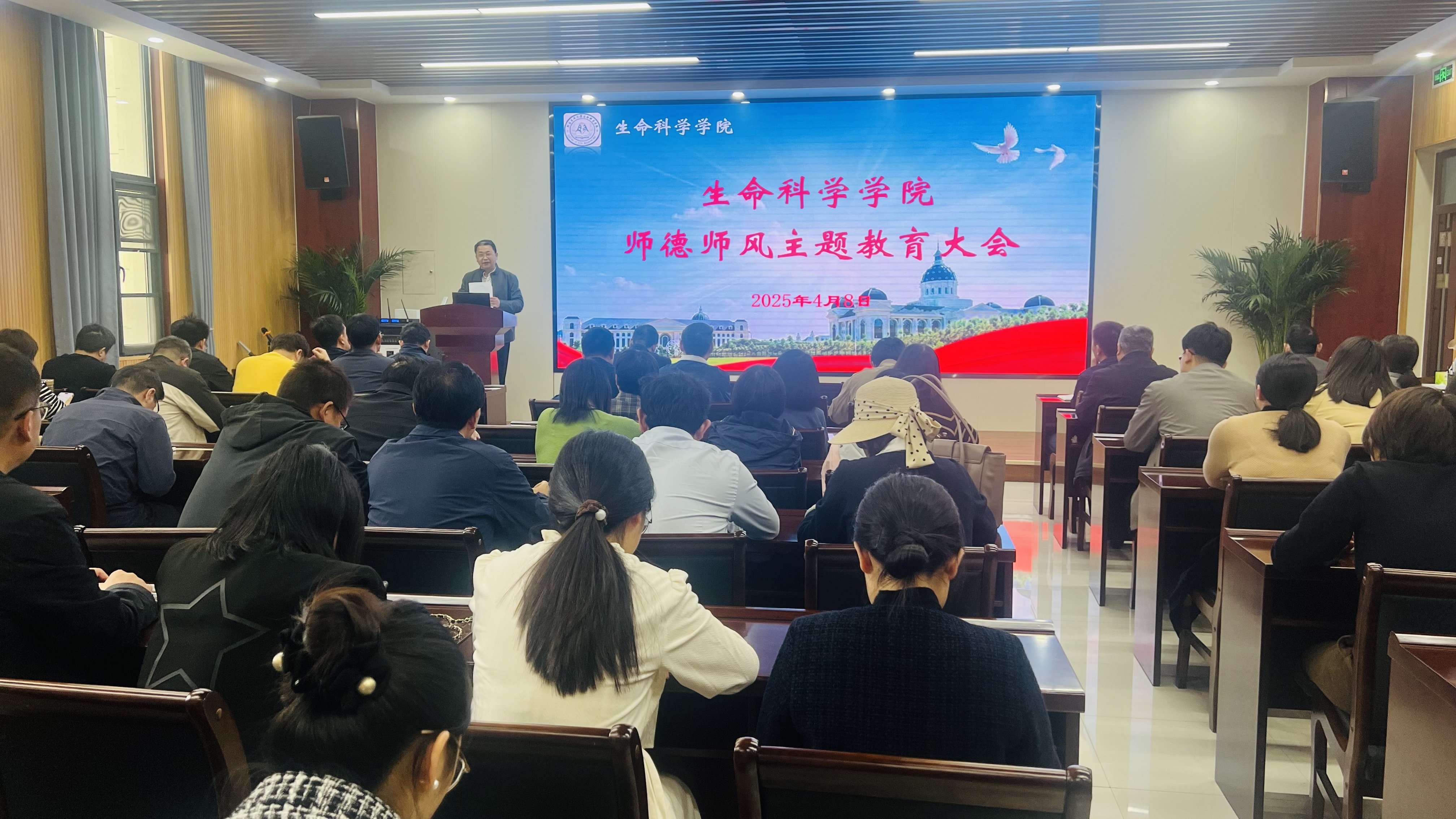 于4月8日在231报告厅举办师德师风专题教育暨师德承诺书签订活动。全体教职工参加会议,会议由院党委书记刘国兵主持。