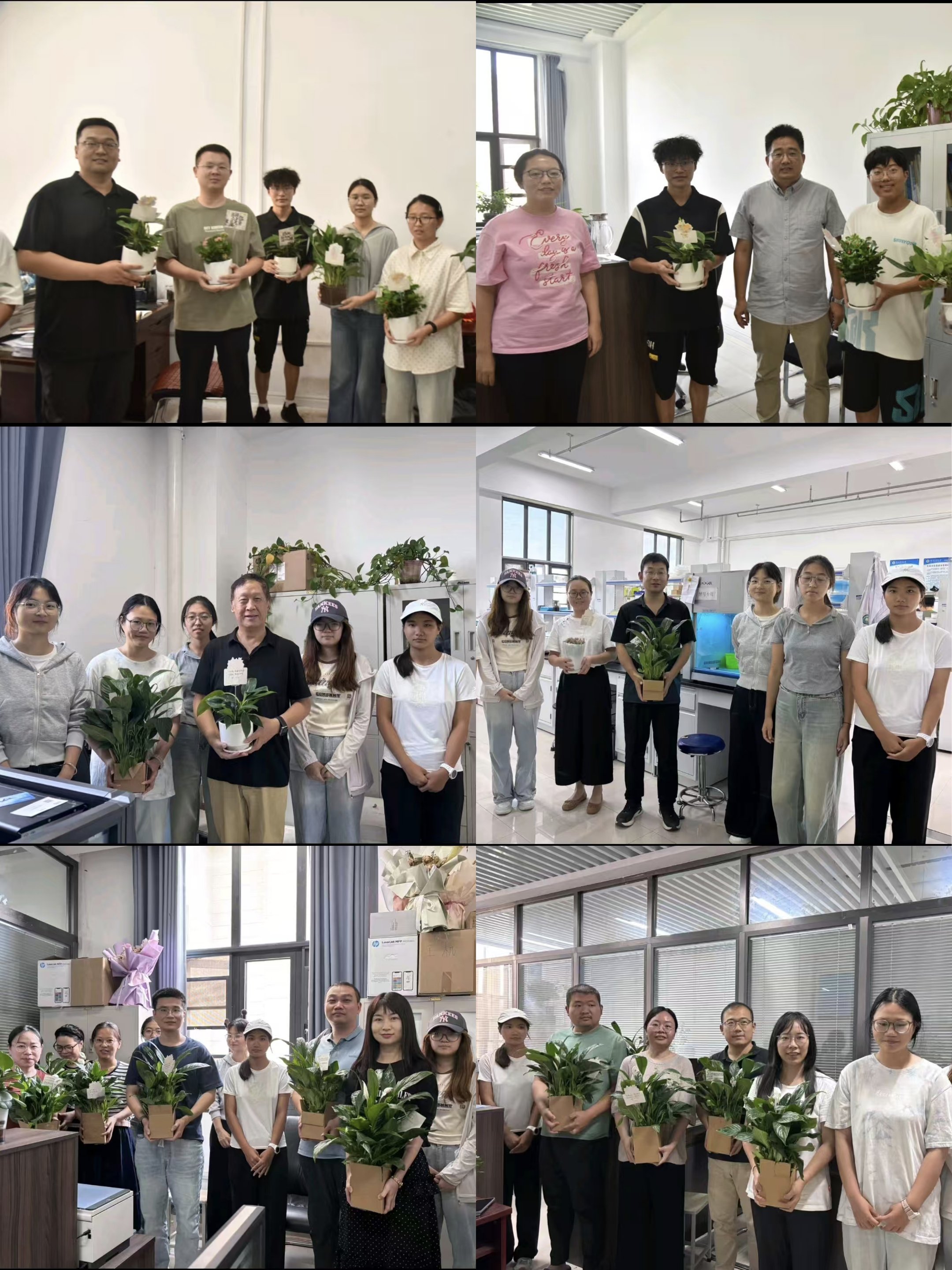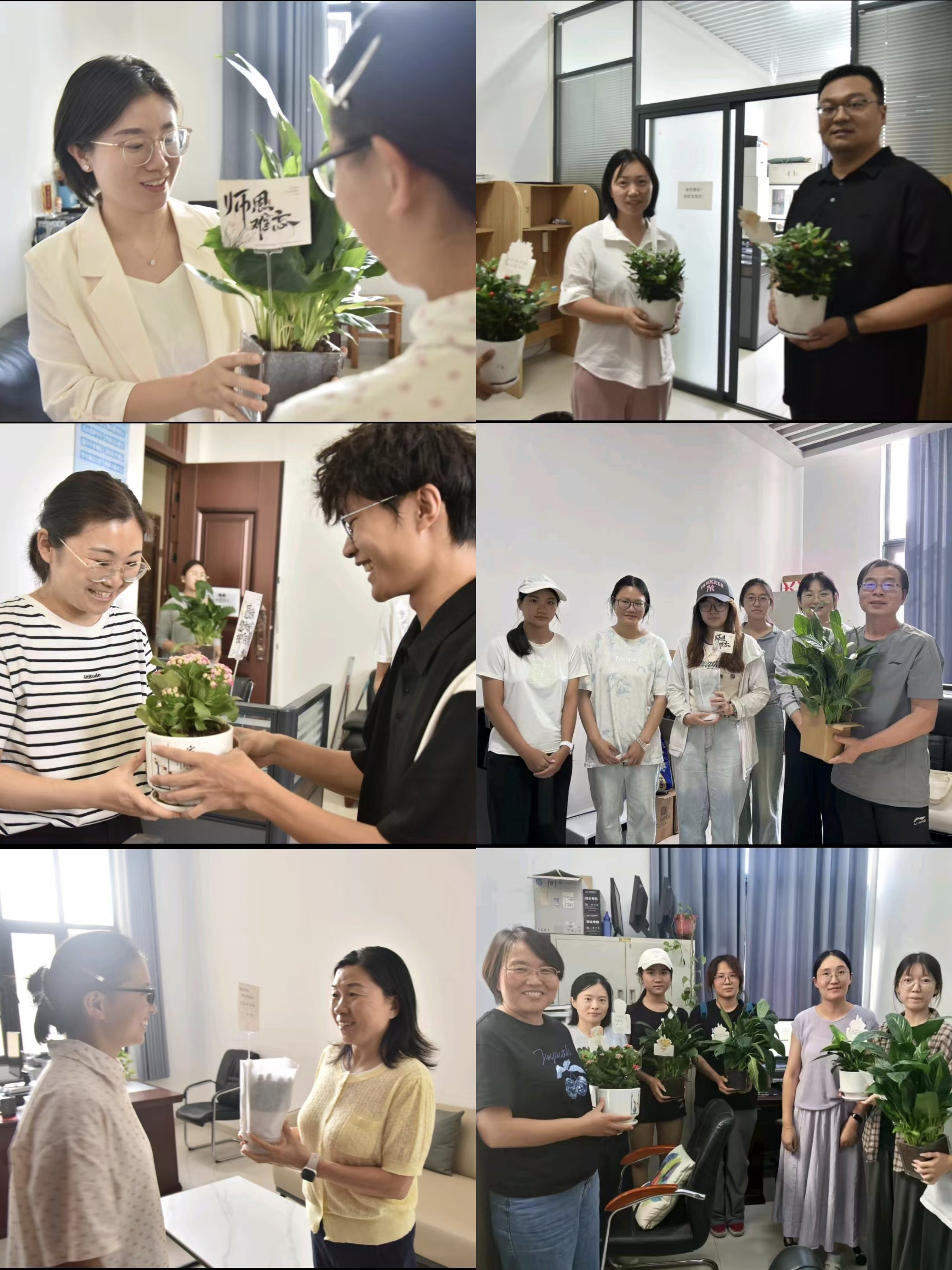 各系工会组长带领学生代表前往各系老师办公室开展以“喜迎教师节,绿植映满院”为主题的教师节献花活动。学生们亲手将绿植和贺卡送至老师手中,并与老师亲切交流。